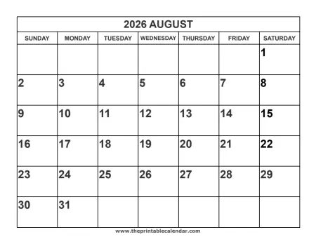Preview of printable 2026 august calendar: