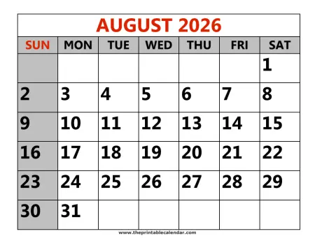 Preview of August 2026 printable calendar - Large dates: